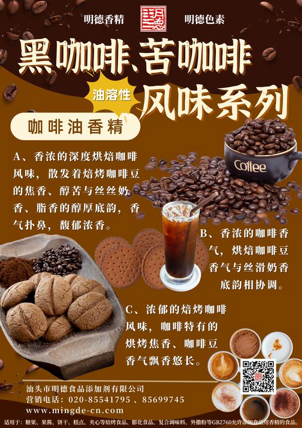 近年來,國內(nèi)咖啡消費氛圍愈來愈濃,咖啡風味多元融入了各個領域,如 果凍、餅干、雪糕等,甚至應用于室內(nèi)香氛等。順應市場潮流,提升味覺體驗。汕頭市明德食品添加劑有限公司不斷創(chuàng)新、潛心專研,當前我們擁有20余款咖啡相關風味的香精,供您選擇。并持續(xù)不斷創(chuàng)新,努力研發(fā)更多符合市場需求的風味。