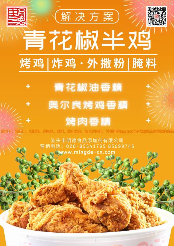 明德食品添加劑 為烤雞、炸雞腌料、外撒粉的廠家朋友們提供了“青花椒半雞”風味的解決方案,使廠家朋友們更好更方便的應用。